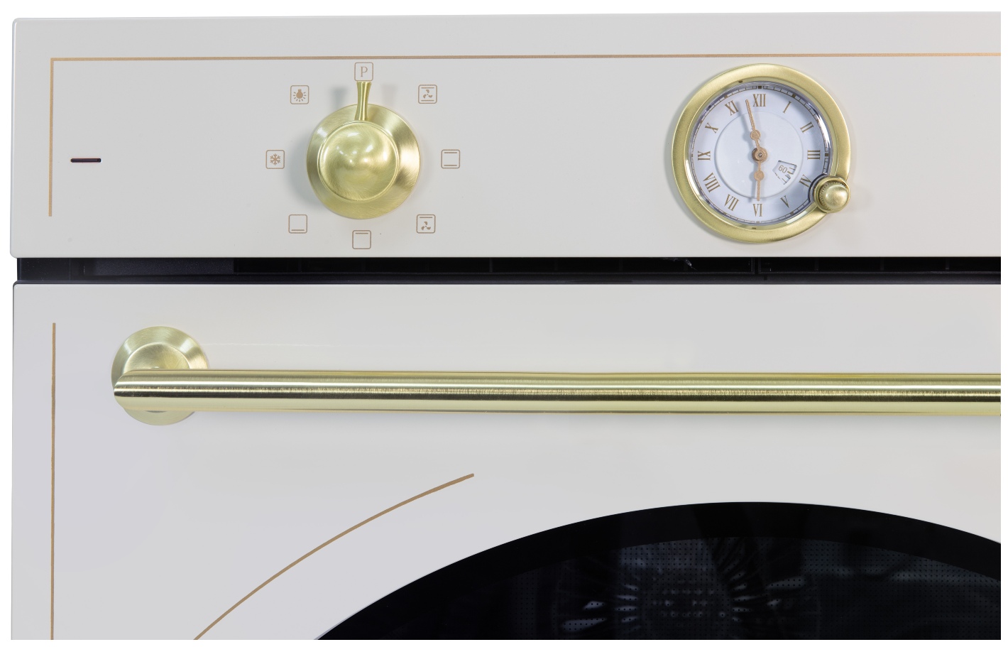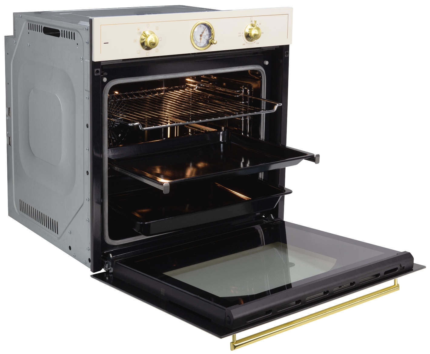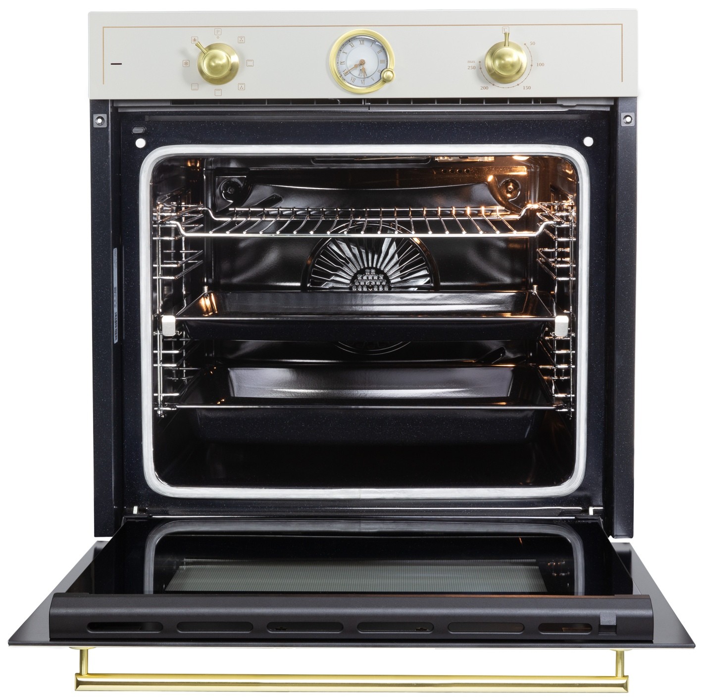 - Особенности конструкции: вентилятор охлаждения, двухуровневое освещение, доводчик двери, полностью стеклянная внутренняя поверхность дверцы духовки, телескопические направляющие