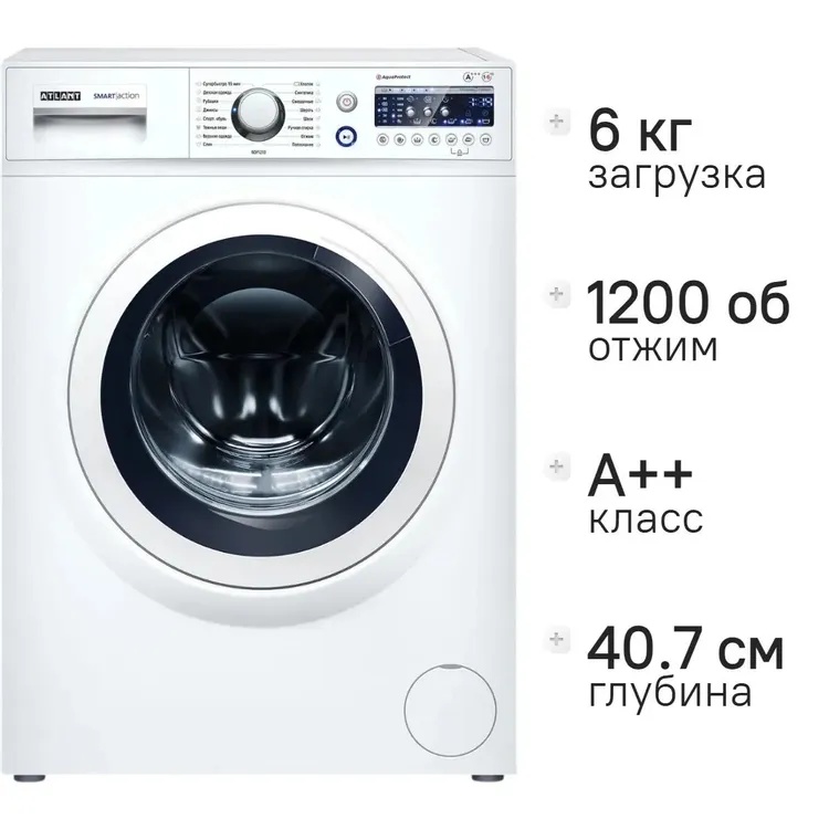 - Безопасность и управление: блокировка от случайного нажатия, дисплей, защита от детей, защита от протечек, защита от скачков напряжения, контроль дисбаланса, самодиагностика неисправностей