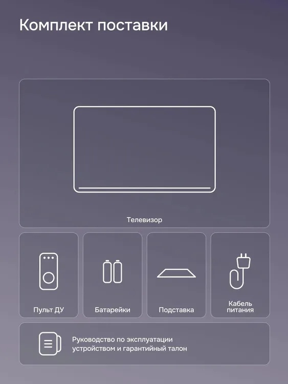 - Комплектация: Упаковка, Телевизор, Пульт управления, Комплект батареек, Подставка телевизора, Комплект крепления подставки, Руководство по эксплуатации, Гарантийный талон